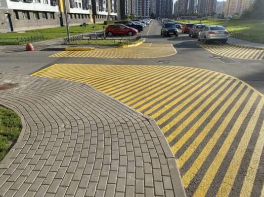 Важно: Знаки и разметка взаимно дополняют друг друга. Жёлтая 1.4/1.10 может дублировать знаки 3.27 «Остановка запрещена» и 3.28 «Стоянка запрещена». В реальных дворах теперь часто используют только разметку — это законный способ ввести соответствующий запрет.