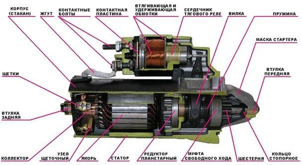 Стартер — это мощный электродвигатель, который запускает вращение коленвала при запуске двигателя. Он состоит из: